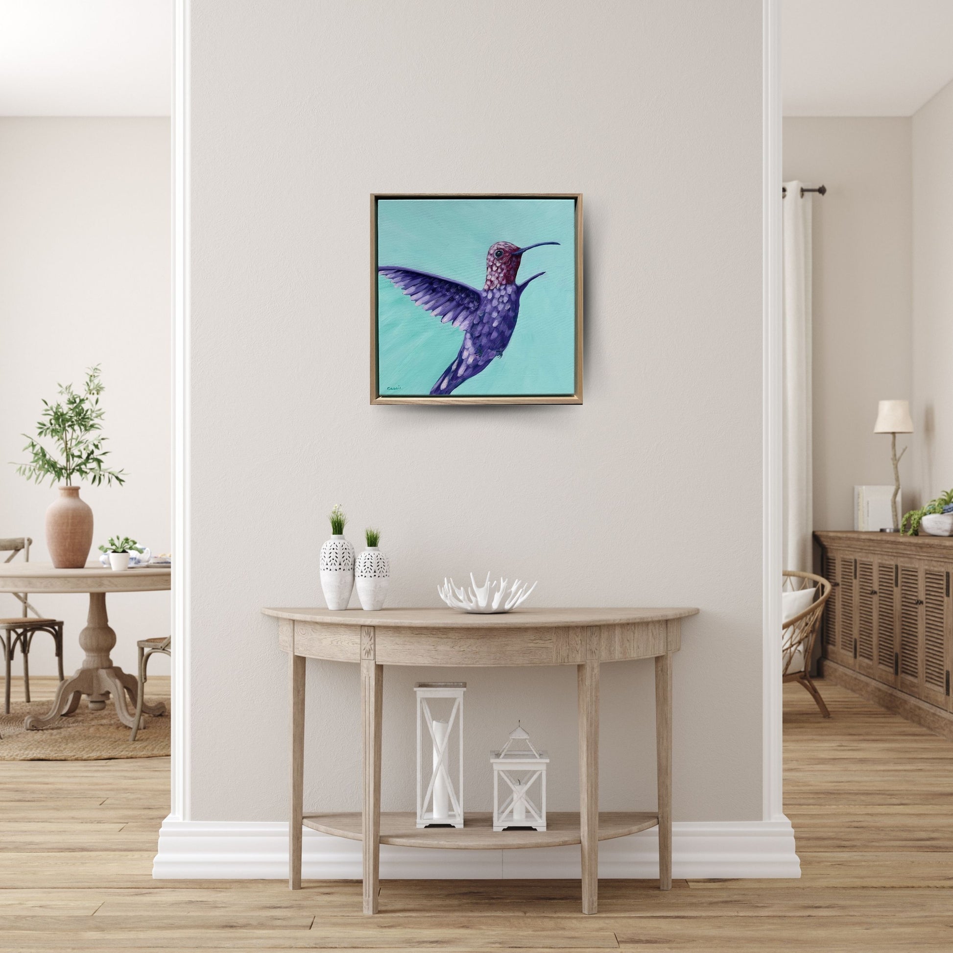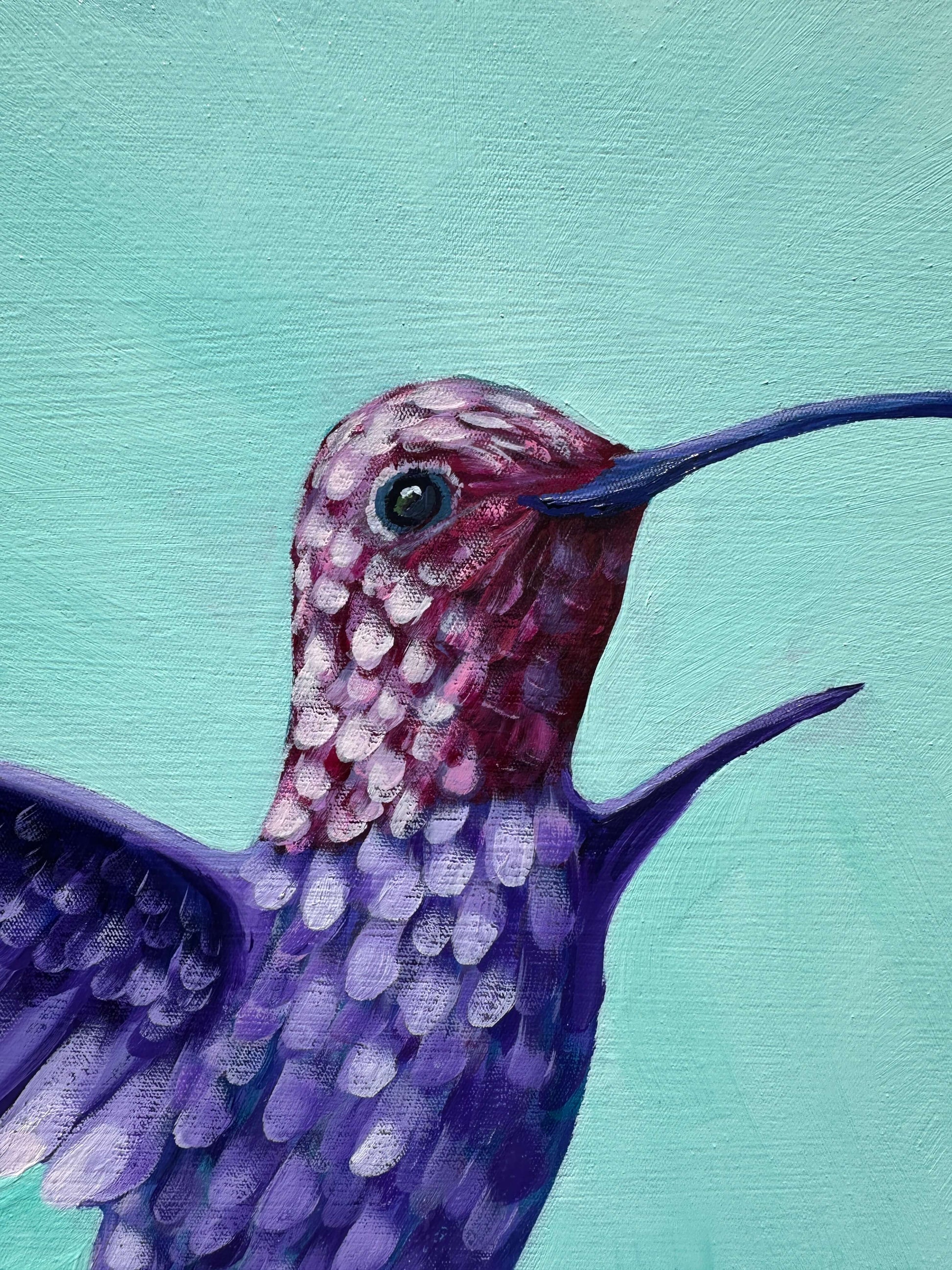 Painted in oils with soft, layered brushstrokes, her feathers shimmer in shades of violet and magenta against a calm turquoise background. The colours and movement work together to create a sense of serenity, joy, and pure enchantment, like standing in the garden again, watching her hover in the sunlight.