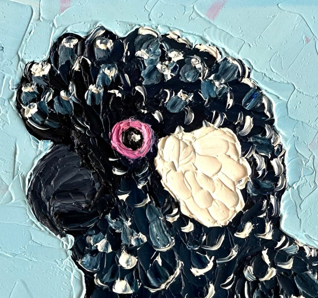 A Carnaby’s Black Cockatoo painted in textured oils. Cheeky captures the bold spirit and fluffy beauty of this striking Aussie bird.