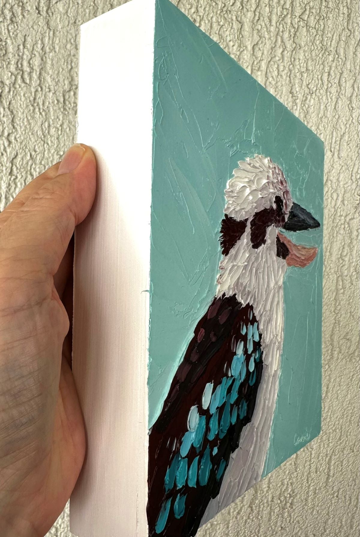 With thick oils and palette knife strokes, I created rich textures in the feathers and background, giving this happy little kookaburra depth, personality, and charm. The background colour perfectly complements the bird, making the painting sing with joy.