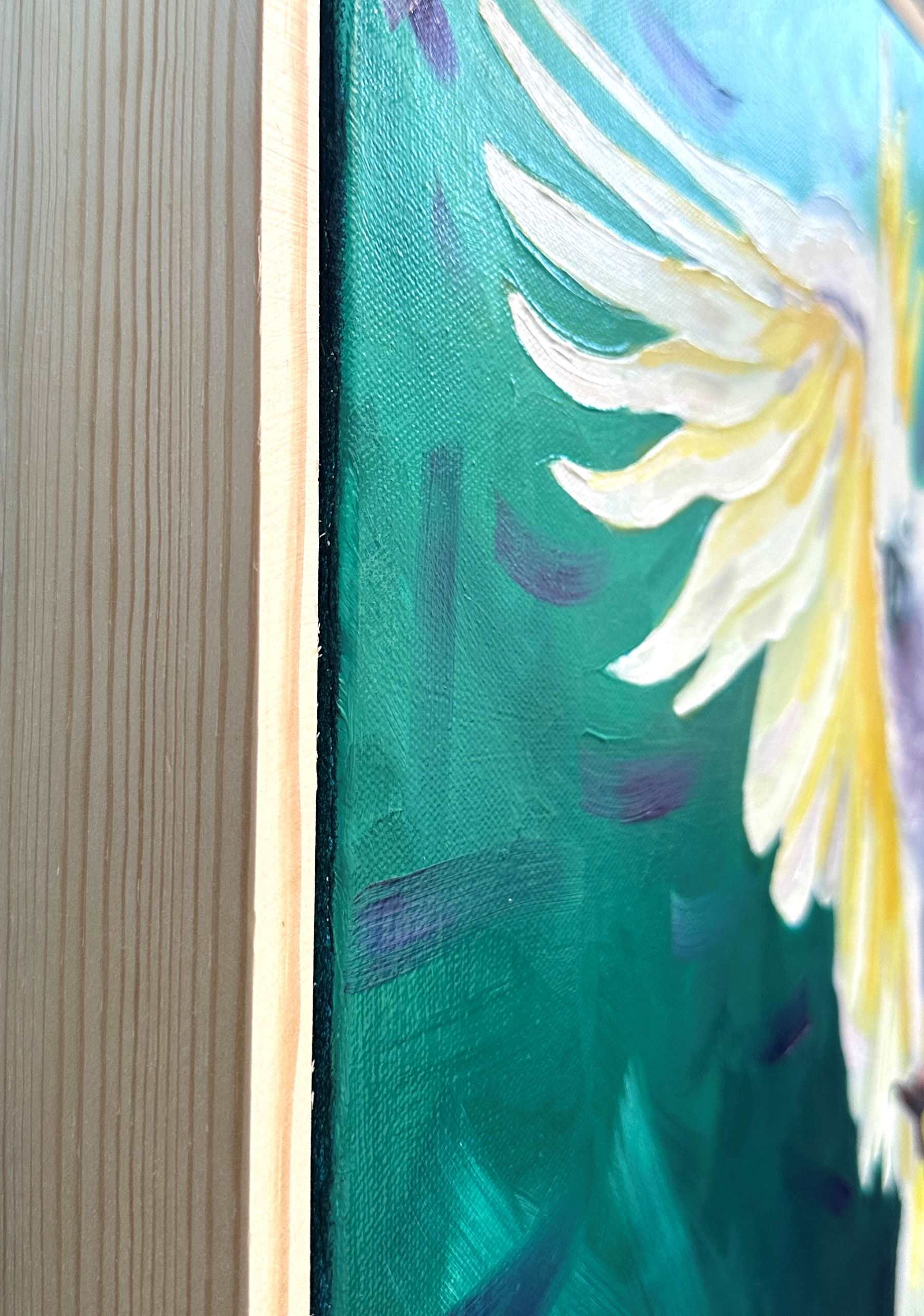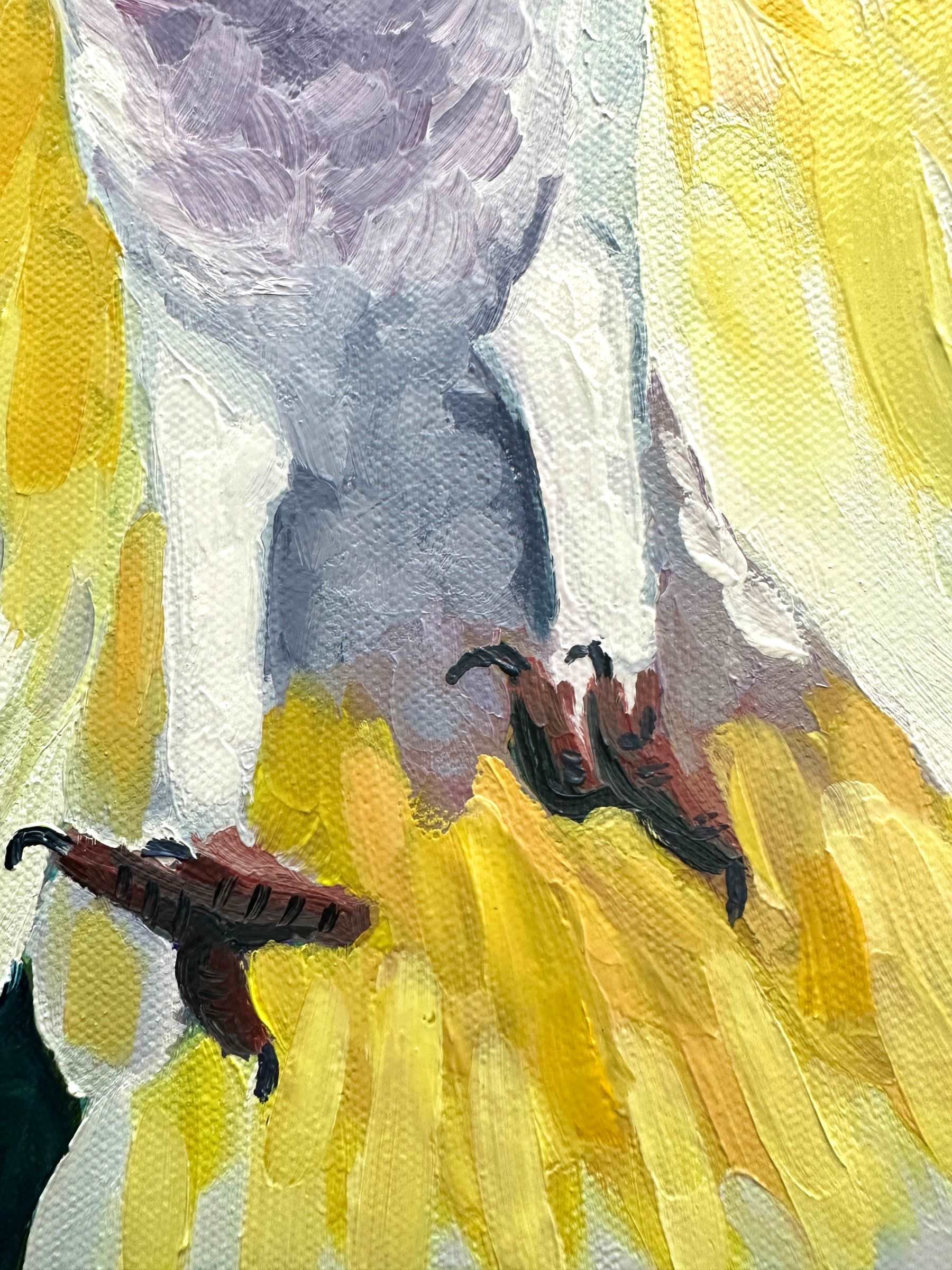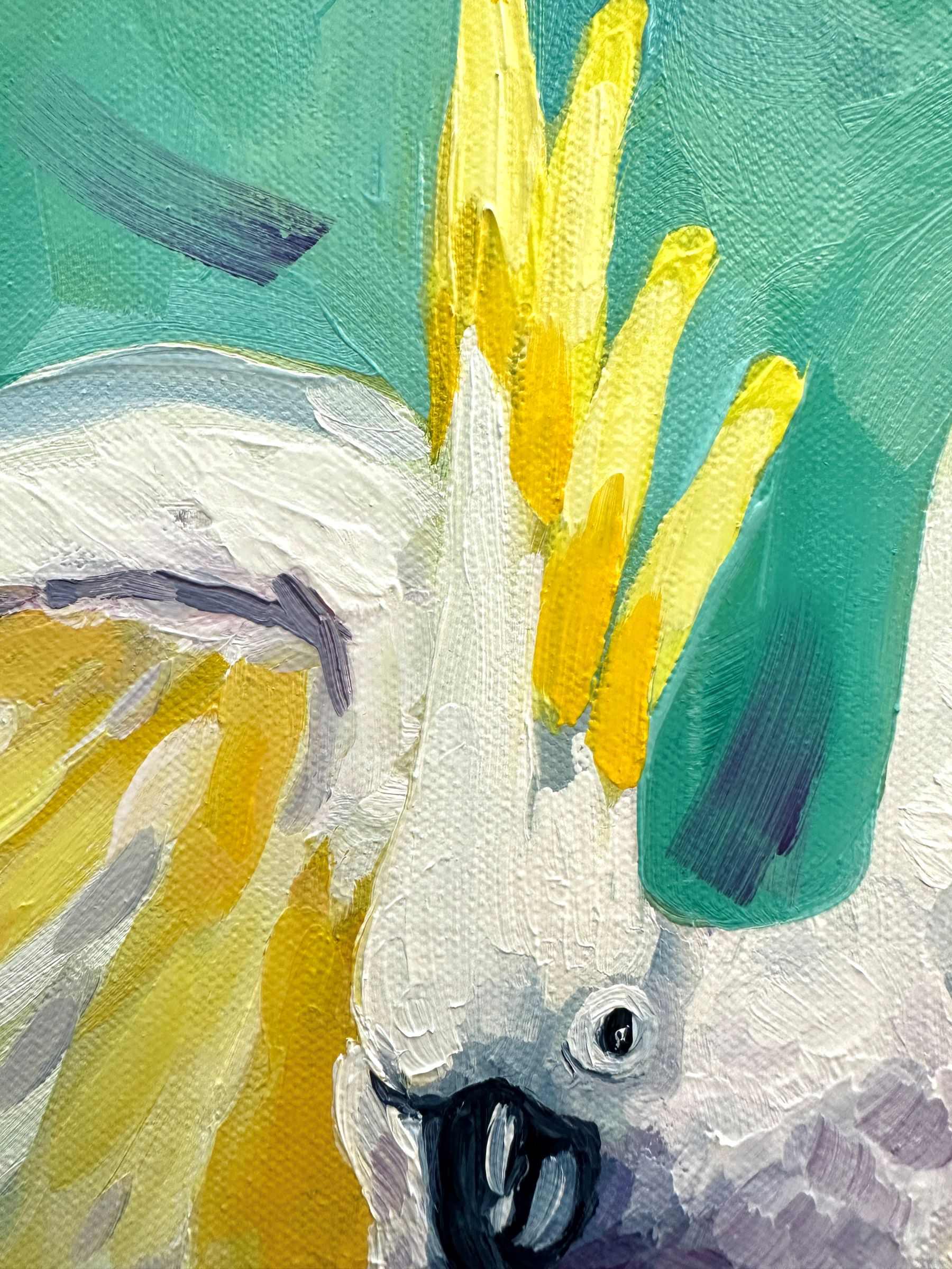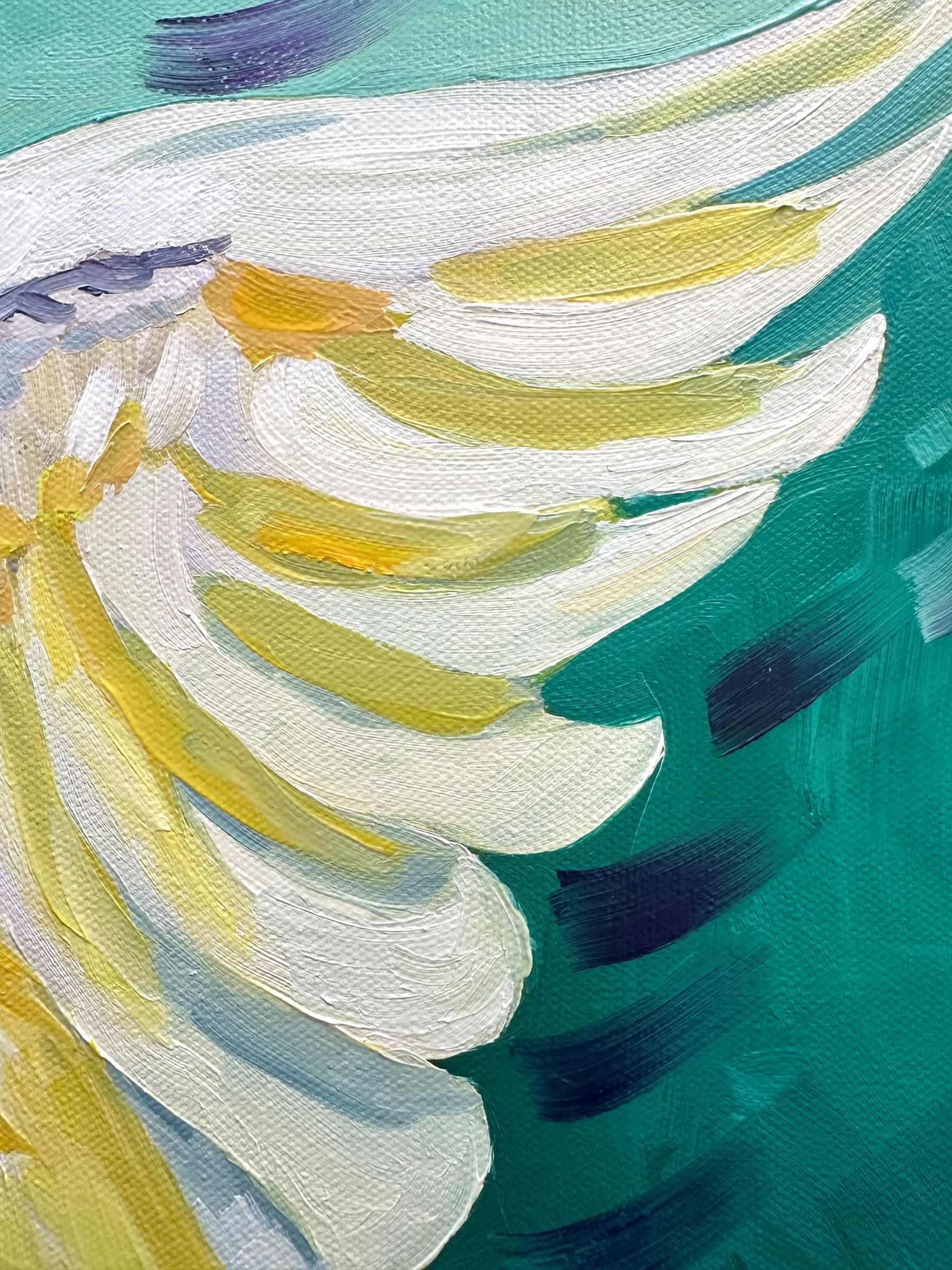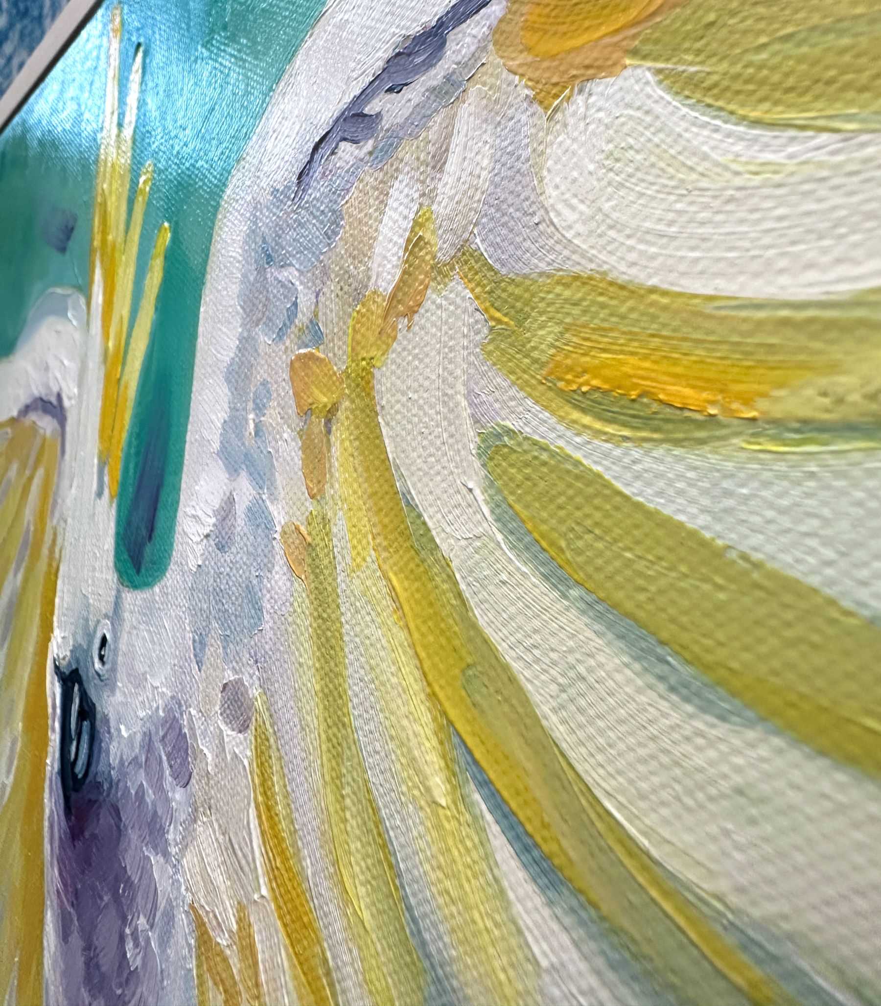 A dynamic cockatoo with outstretched wings, painted in textured oils. Cockatoo Landing captures the grace and playfulness of this Aussie favourite.