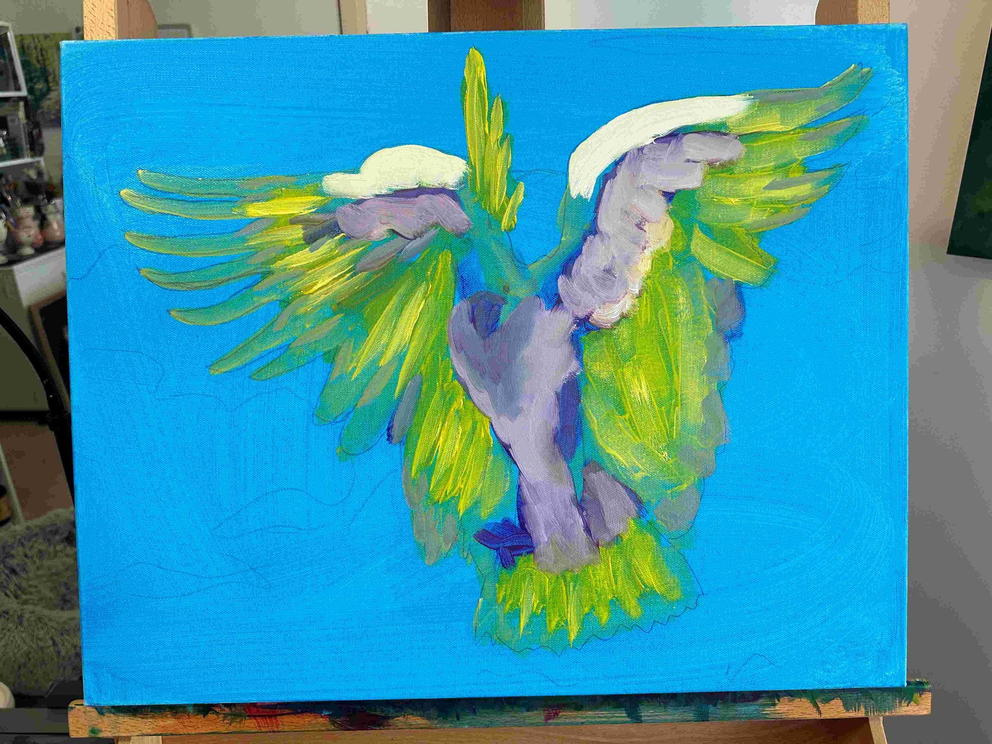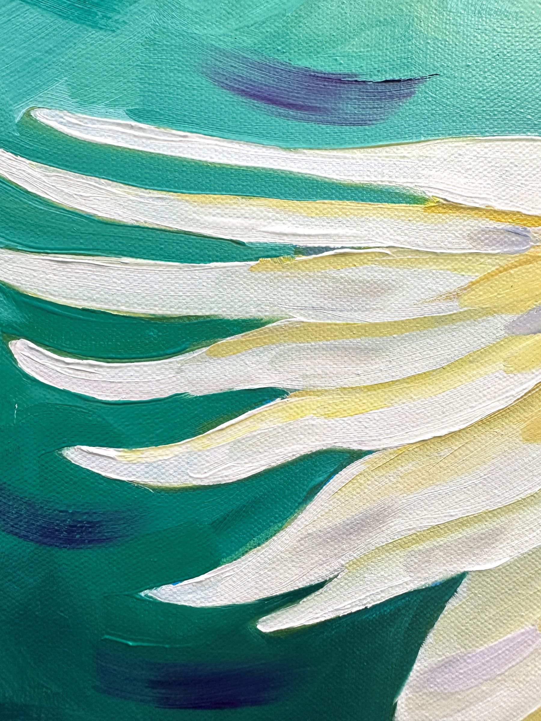 Painted in oils with both brush and palette knife, the textures bring the feathers and movement to life, making the bird feel as though it’s about to flutter right into your space.