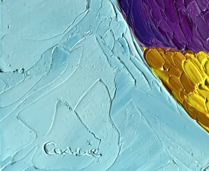 Painted in thick oils with palette knives, Francis features textured feathers, a soft pale yellow backdrop, and a joyful sense of companionship (as part of a finch pair with its partner piece Faith). Compact and versatile, it’s perfect for standing on a shelf or hanging on a wall. This piece is not only a celebration of Australia’s birdlife but also a personal tribute to my childhood, when my dad bred finches in our backyard aviary.