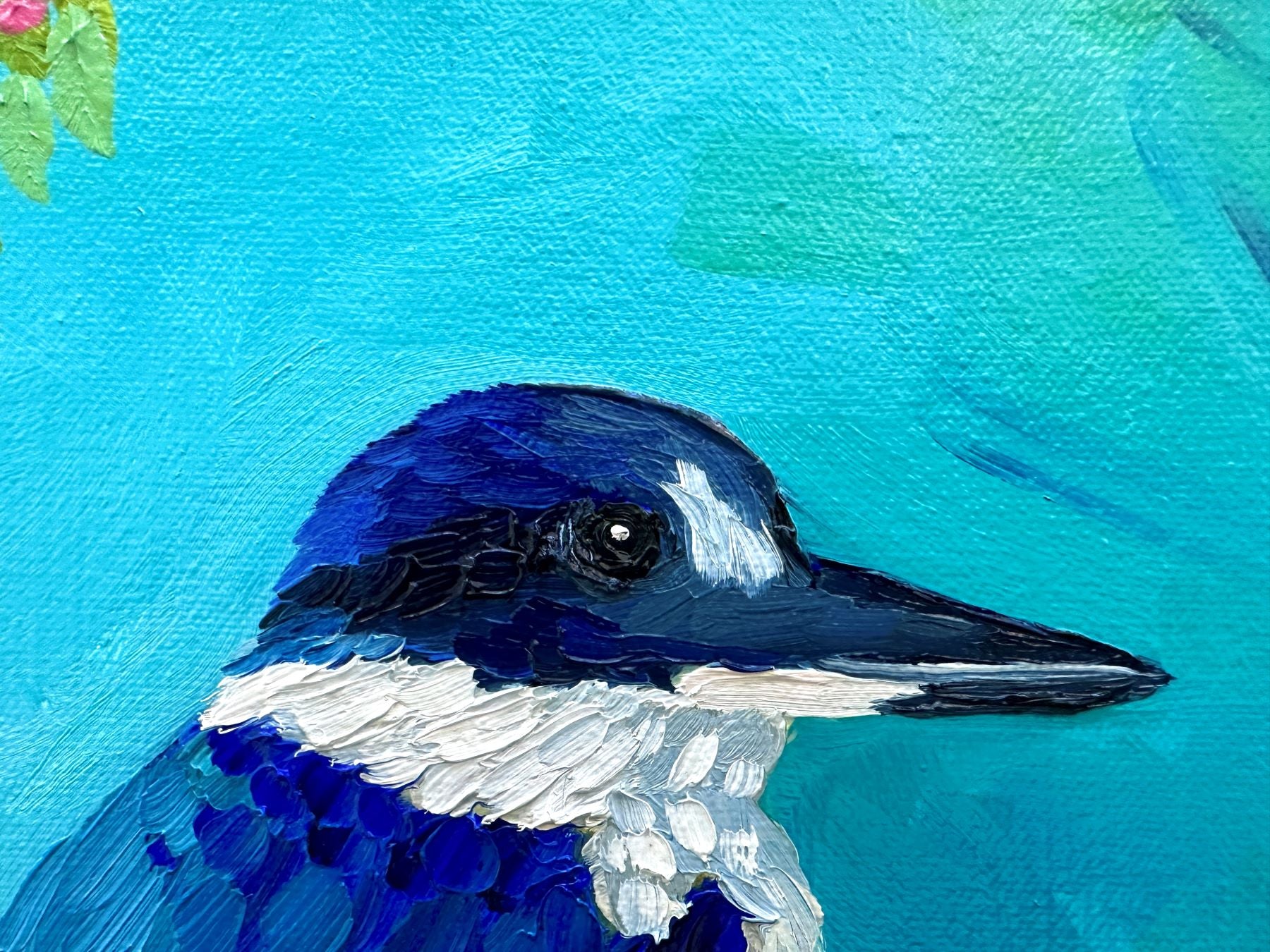 King of Blue celebrates the beauty of the Australian Kingfisher, painted in vibrant hues with richly textured feathers. Using thick oil paint and dynamic strokes, I’ve brought the Kingfisher’s plumage to life, while loose yellow Jacaranda flowers add a soft, harmonious backdrop. The interplay of colour and texture creates a joyful, mesmerising artwork that draws you in.