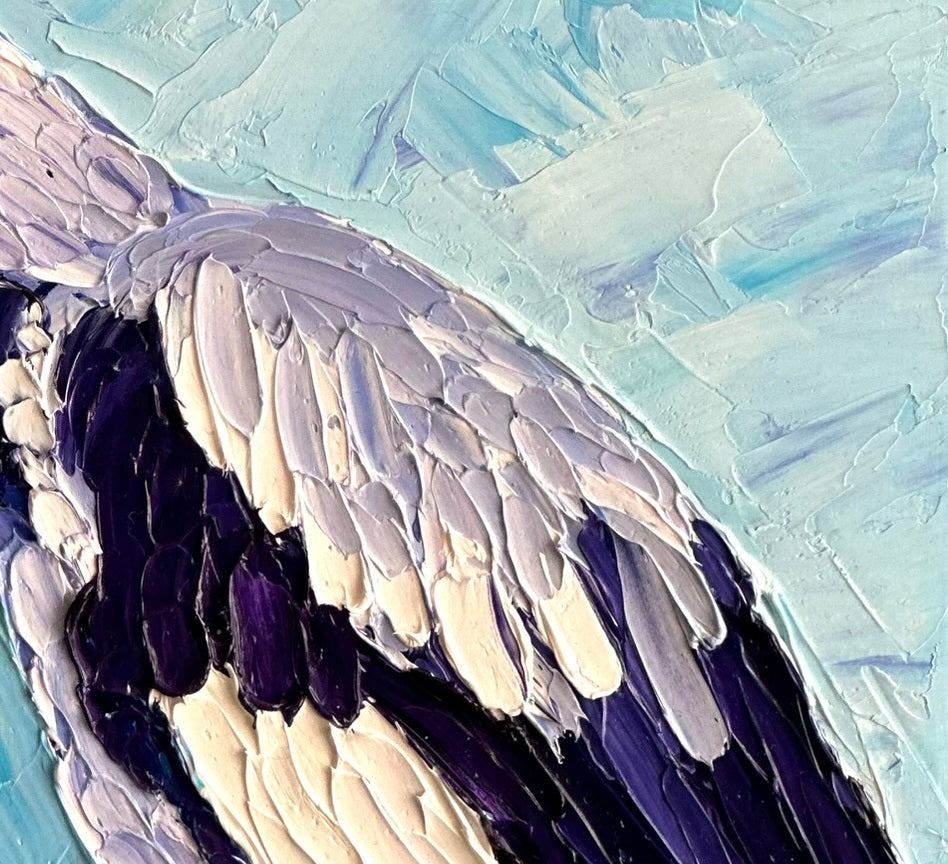 Painted in oils with palette knives, Mac is rich in texture, from the layered feathers to the background. Compact in size, this artwork is perfect for shelves, desks, or as part of a gallery wall. Pair it with Max for a joyful magpie duo, or let it shine on its own.