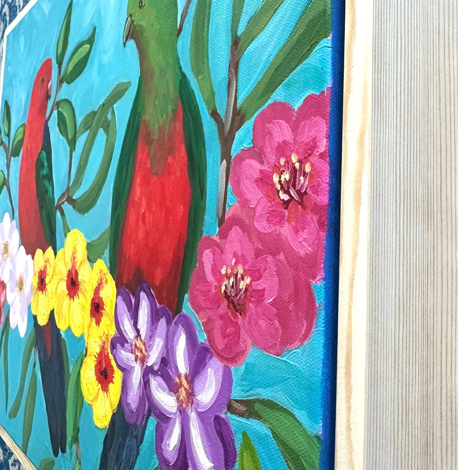 A vibrant pair of King Parrots surrounded by flowers. Royal Couple is a textured oil painting that celebrates the beauty and colour of Australian birdlife.
