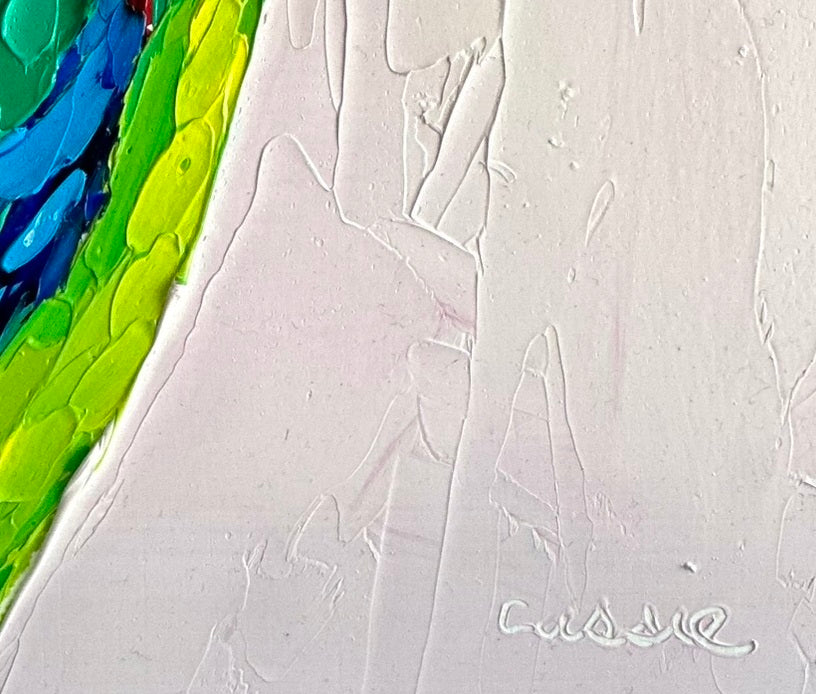 I painted a pair of Swift Parrots, because I love that they have company, and set them against a soft peach background to balance their colours. Created with thick oil paint and palette knives, this piece is rich in texture, from the lively feathers to the layered backdrop. Sammy is a vibrant reminder of the beauty, and fragility, of Australia’s unique wildlife.