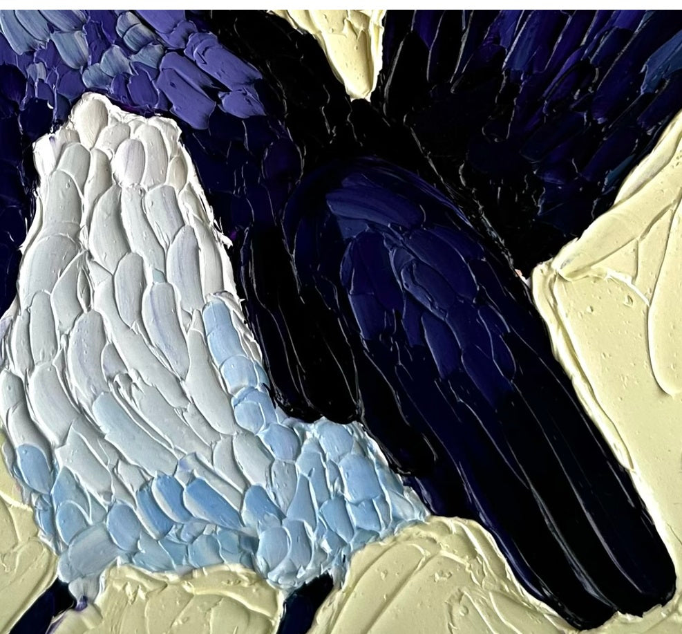 - Textured and Vibrant – Thick palette knife work brings depth and life to each feather.